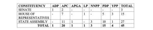 The political parties are: Action Democratic Party (ADP), All Progressives Congress (APC), All Progressive Grand Alliance (APGA), Labour Party (LP), New Nigeria Peoples Party (NNPP), Peoples Democratic Party (PDP) and the Young Progressive Party (YPP)