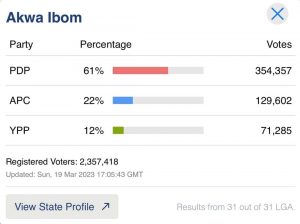 In Akwa Ibom state Pastor Umoh Bassey Eno of the Peoples Democratic Party won convincingly with 356,346 votes to defeat Senator Bassey Akpan of the APC who scored 136,262 votes.