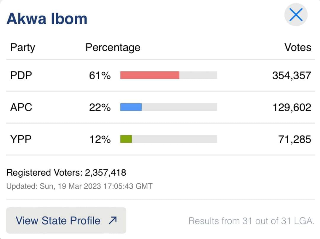 In Akwa Ibom state Pastor Umoh Bassey Eno of the Peoples Democratic Party won convincingly with 356,346 votes to defeat Senator Bassey Akpan of the APC who scored 136,262 votes.