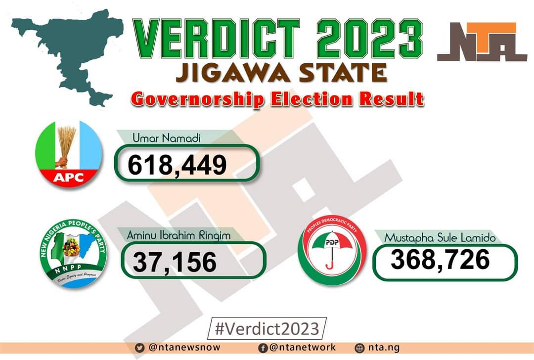 In Jigawa, the candidate of the APC emerged victorious with a landslide vote of 618,449 to defeat his closest rival Mustapha Lamido of the PDP who scored 368,726 votes. The APC candidate won with a marging of 249,723 votes.