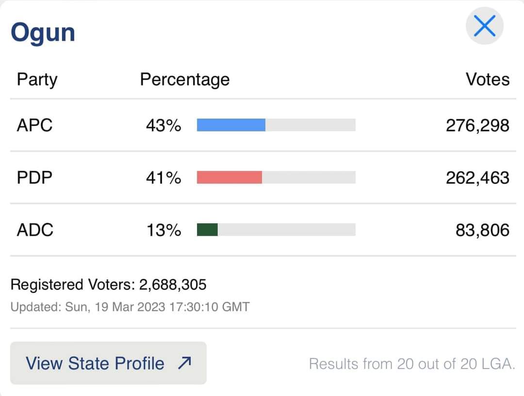 More results of Saturday’s governorship election have been announced by the Independent National Electoral Commission (INEC). Some of the results show that Governor Dapo Abiodun of Ogun state the APC gubernatorial candidate was re-elected by a total of 276,298 votes defeating his closest rival Oladipo Adebutu of the PDP who scored 262, 383 votes and Otegbeye of ADC who received 94,754 votes.