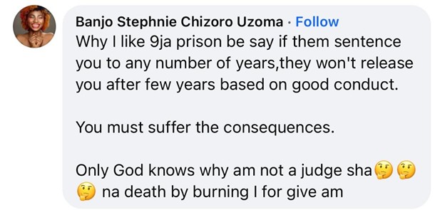 One of the comments by Banjo Stephnie Chizoro Uzoma read, “Why I like 9ja prison be say if them sentence you to any number of years, they won’t release you after few years based on good conduct.You must suffer the consequences. Only God knows why am not a judge sha🤔🤔🤔 na death by burning I for give am.”