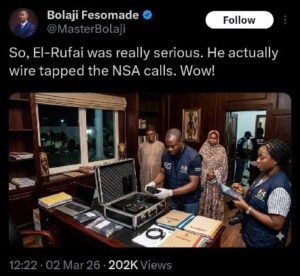 On the 2nd of March 2025, X user @MasterBolaji posted a photo with the caption, “So, El-Rufai was serious. He actually wiretapped the NSA calls. Wow”