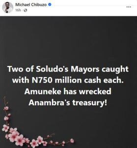 In a viral post on Facebook on 7th November, 2025, Michael Chibuzo claimed that two Soludo mayors were caught with a sum of 750 million naira each in cash; this is coming amid the ongoing off-cycle election. The post reads, “Two of Soludo’s mayors were caught with N750 million cash each. Amuneke has wrecked Anambra’s treasury!”