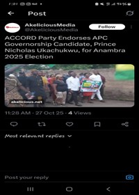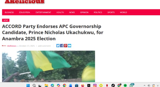 A statement circulating on social media alleges that the Accord Party in Anambra State has announced its support for the All Progressives Congress and endorsed the party’s gubernatorial candidate, Prince Nicholas Ukachukwu, for the upcoming off-cycle governorship elections in the state.
