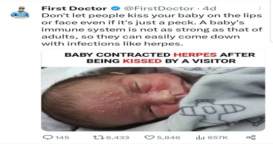 Claim: A post by a twitter user, @FirstDoctor claims that kissing a baby on lips or face causes oral herpes.