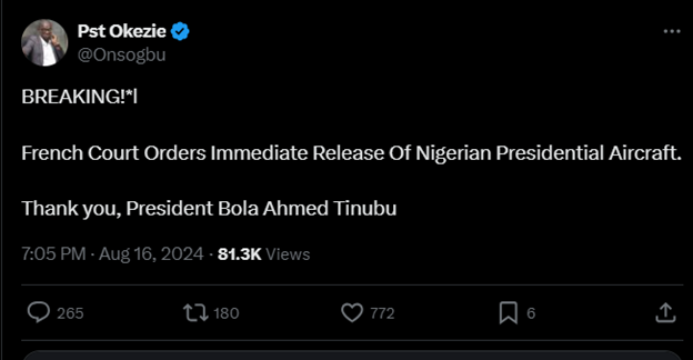 On August 16th, 2024, a social media user on X (formerly Twitter), with the username Pst Okezie@Onsogbu posted on his wall that a French court has given an order for the immediate release of the Nigerian presidential aircraft.