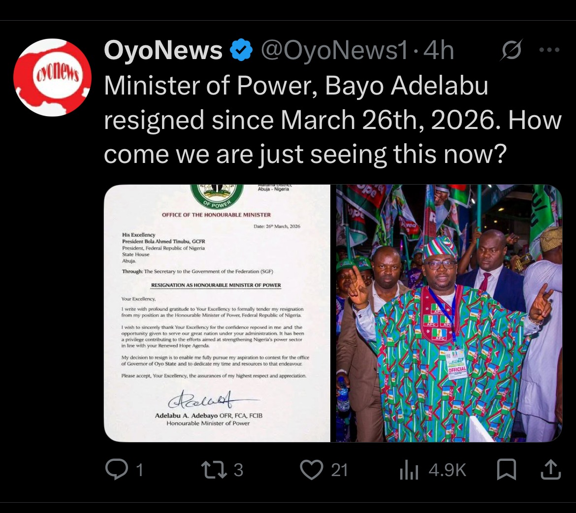 On March 31st, 2026, a letter allegedly authored by Honourable Minister of Power, Adebayo Adelabu, announcing his resignation as Nigeria’s Minister of Power, circulated widely on social media. Many reports indicated that his resignation was to allow him time to prepare for the Oyo State governorship election.