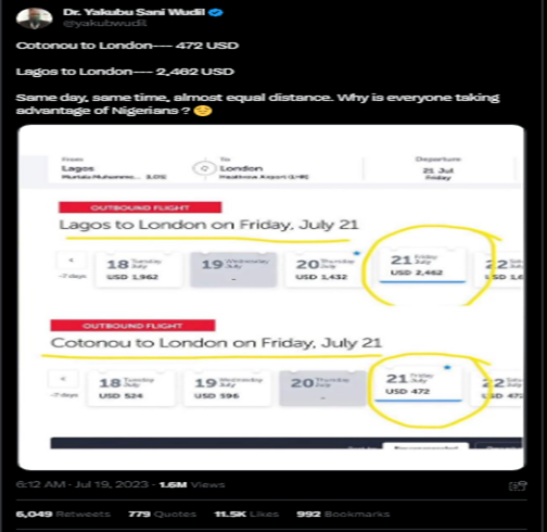 A Twitter user, Dr. Yakubu Sani Wudil, an “assistant professor” at King Fahd University, Saudi Arabia (as revealed by his Twitter profile), tweeted an image which is a collage of snapshots of flight prices from Lagos to London and from Cotonou to London.