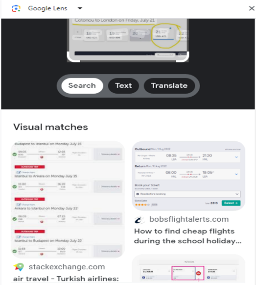 The first image that came back as visual matches one of the pictures shared on the Twitter post. The image also contained information of flight bookings with Turkish airlines, accompanied by link to an article about Turkish airline. By this revelation, it became clear that the Twitter image was obtained from Turkish airline website.