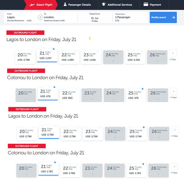 The result shows the cheapest Turkish airline flight for economy class from Lagos to London on Friday, July 21 cost $1,247, while the same airline flight from Cotonou to London for the same category on the same day costs $476, giving a difference of $771.