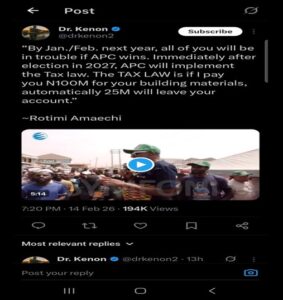 “By January/February next year, all of you will be in trouble if the APC wins. Immediately after the 2027 election, the APC will implement the tax law. The tax law means that if I pay you ₦100 million for your building materials, ₦25 million will automatically leave your account.”