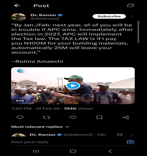 Claim: An X user, @drkenon2, shared a video featuring former Rivers State governor and ADC chieftain, Mr Rotimi Amaechi, claiming that the new tax law mandates a 25% automatic deduction on every transaction.