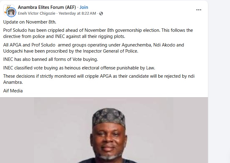 On November 5th, 2025, a Facebook page published a statement alleging that the Inspector General of Police has proscribed security outfits operating in Anambra State. The post claimed, “All APGA and Prof Soludo armed groups operating under Agunechemba, Ndi Akodo, and Udogachi have been proscribed by the Inspector General of Police.”