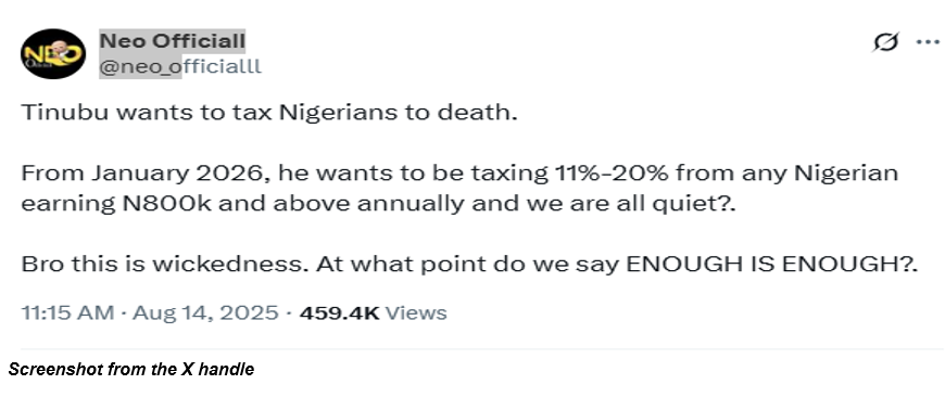 On 14 August 2025, an X user, @neo_officalll, posted a claim alleging that Nigerians earning ₦800,000 and above annually would be taxed between 11% and 20% from January 2026. His comment read: “Tinubu wants to tax Nigerians to death. From January 2026, he wants to tax 11%-20% of any Nigerian earning ₦ 800,000 and above annually, and we are all quiet? Bro, this is wickedness. At what point do we say ENOUGH IS ENOUGH?”