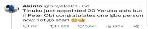 Is it true that President Tinubu has appointed 20 Yoruba as Aides in his government? Verdict: Incorrect Full Story A Twitter user Akinto tweeted on 11 July, 2023, claiming that Tinubu has just appointed 20 Yoruba aides in his new government. Tweeted post The tweet has so far generated 187 views, 1,911 retweets,