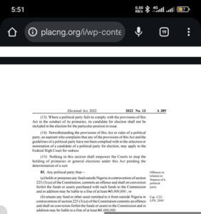 Screenshot from the Electoral Act Law 2022 on PLAC