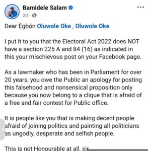 Another member of the House of Representatives, Honourable Bamidele Salaam, representing Ede North, South/Egbedore/Ejigbo Federal Constituency, also faulted Hon. Oluwole Oke’s claim, stating that the Electoral Act 2022 does NOT have sections 225A and 84(16) as indicated.