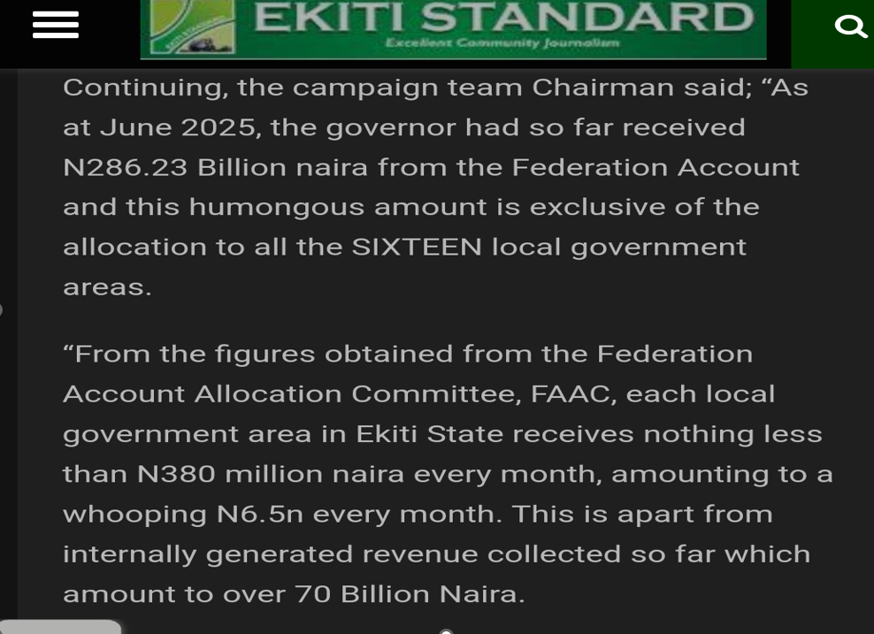 Claims: Engr Kayode Ojo’s campaign group claims that Governor Oyebanji of Ekiti State received N286.23 billion from the Federation Account as of June 2025, with Internally Generated Revenue...
