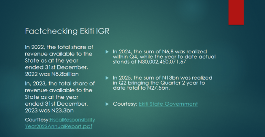 In conclusion, Kayode Ojo’s campaign group’s claim that “the internally generated revenue collected by the governor so far amounted to over N70billion” was TRUE.