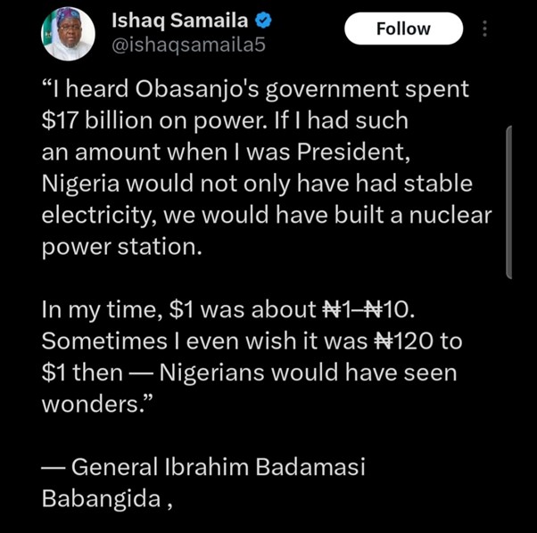 Claim: A viral quote shared by an X user, @ishaqsamaila5, attributes the following statement to Ibrahim Badamasi Babangida: “I heard Obasanjo’s government spent $17 billion on power. If I had such an amount when I was President, Nigeria would not only have had stable electricity, we would have built a nuclear power station. In my
