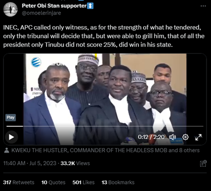 In the 2 minutes, 20 seconds video, Mr. Ezekhome said: “we were also able to elicit from the witness that Tinubu did not win in his own state, and he was the only presidential candidate that did not win in his own state, all others won”. See the screenshot of the tweet below: