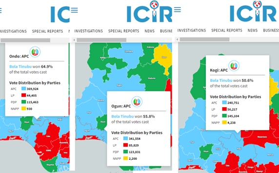 A scan through the dashboard for the 2023 Nigerian presidential election hosted on the website of the International Centre for Investigative Reporting (ICIR) shows that none of the selected candidates won in their respective states, that is Ondo, Ogun and Kogi states.