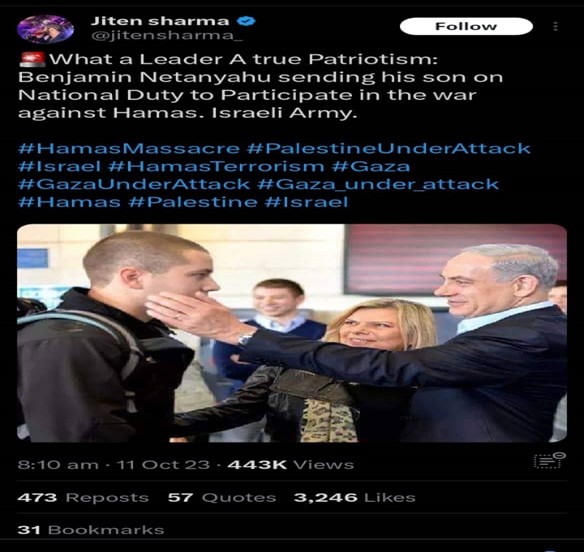 An X-user Jiten sharma shares a post, claiming that the Israeli Prime Minister, Benjamin Netanyahu is sending his son, Avner Netanyahu to fight in the on-going war between Israeli defense forces and Hamas.