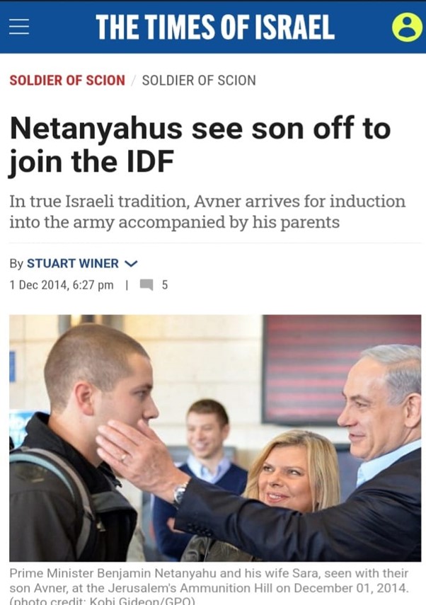 The newspaper had published a story in December 2014, highlighting the beginning of the military service of the Prime Minister’s youngest son, Avner Netanyahu, in the Israel Defense Forces. The picture shows the Prime Minister and the mother seeing Avner off to the IDF’s induction centre near Tel Aviv. See the screenshot below: