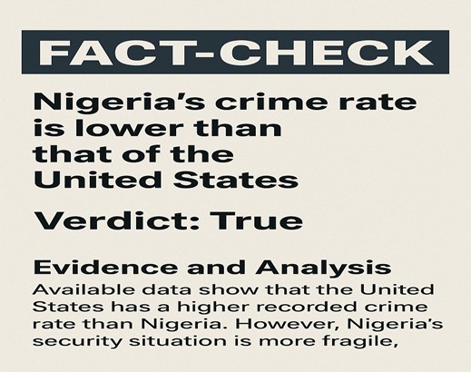 Claim: Nigeria’s crime rate is lower than that of the United States. Verdict: True. Available data show that the United States has a higher recorded crime rate than Nigeria. However, Nigeria’s security situation is more fragile, with higher risks from insurgency, kidnapping, and armed conflict. Background Story A presidential aide, Daniel Bwala, recently claimed that