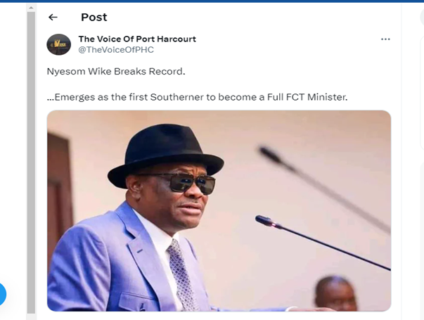 With respect to that, a Twitter User with the username @TheVoiceOfPHC has claimed that the former Rivers state governor is the first Southerner to occupy the position of the Minister of the Federal Territory. In the tweet, the handler stated that “Nyesom Wike Breaks Record. …Emerges as the first Southerner to become a Full FCT Minister.”