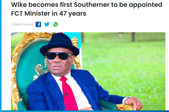 Similarly, PM newspaper, an online media platform, also published on August 16th, 2023, that Nyesome “Wike becomes first Southerner to be appointed FCT Minister in 47 years”.