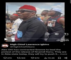 As videos of the Aba protest circulated, @HighChiefOkoro claimed: “Alex Otti has contracted Sowore to lead the protest… they are in Abia today, they will try to push it to other states in the coming days.” The post gained traction, with 72.2k views, 270 responses, and 670 reposts.