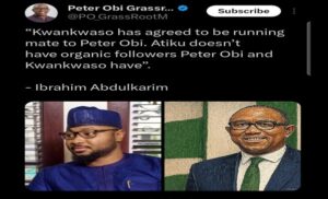 Claim: A group on X, @PO_GrassRootM shared a post claiming that Kwankwaso has agreed to be the running mate to Peter Obi in the 2027 presidential election.