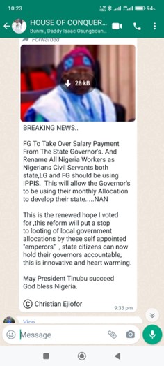 On the 6th of April, 2024 a viral forwarded message claiming that the FG is taking over salary payments from the State Governors. The message has been shared on X and WhatsApp.
