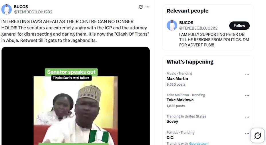 “INTERESTING DAYS AHEAD AS THEIR CENTRE CAN NO LONGER HOLD!!! The senators are extremely angry with the IGP and the attorney general for disrespecting and daring them. It is now the “Clash Of Titans” in Abuja. Retweet till it gets to the Jagabandits.”