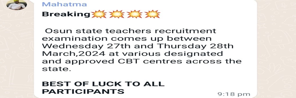 The viral WhatsApp message claiming that “the examination date for the recruitment into public primary and secondary schools in Osun State had been fixed for 27th and 28th March 2024” is not from the Ministry of Education or from the government of Osun State.