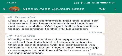 Despite the warning, there have been messages circulating on social media, most especially WhatsApp, that the Osun State Government has announced the examination screening date for all applicants who applied.