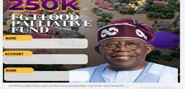 Claim: The federal government is giving N250k as a flood grant Verdict: False Background The use of phishing websites to proliferate false and misleading information has become a free-flow activity on Social Media, as a Facebook page with the username Sema.com posted on its handle that the Federal Government of Nigeria is rolling out