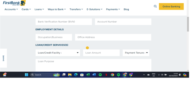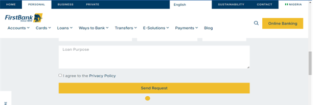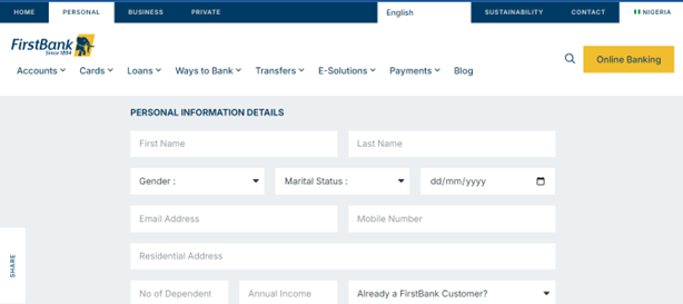 For clarity, we visited FirstBank official website to check the procedures for obtaining a loan from the financial institution. We discovered that the bank has some requirements, which include input of personal data and BVN, among other things in the image below.