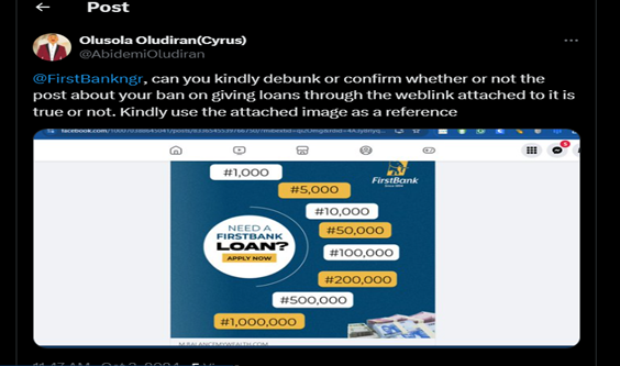The post was attached with a graphic photograph with the FirstBank logo, designed to highlight the available loan options for interested customers. The highlighted amounts of money available for the loan offers range from N1 million to N1,ooo in ascending order. The graphic design also carried boldly written instructions, stating, “Need a FirstBank Loan? Apply Now.” The link attached to the post to obtain the available loan option is here