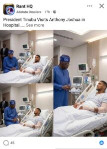According to a post by Rant HQ, a Facebook page reads, “President Tinubu Visits Anthony Joshua in Hospital. My Fellow Patriotic Nigerians, Let’s wish him Quick Recovery. 🙏 #anthonyjoshamustlive #quicjrecovery