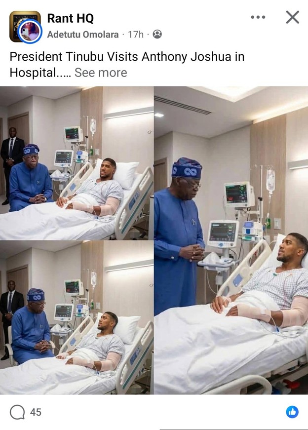 It was therefore curious to find images of the President by the bedside of Anthony Joshua in the hospital. NDRFactcheck came across a post claiming that President Bola Tinubu has gone to pay him a visit at the facility, here, here, here and a video.