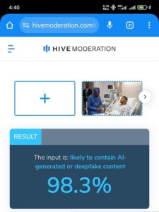 Subjecting the images to AI image detector analysis using Hive Moderation revealed that it was likely to contain AI-generated or deepfake content; it gave a 98.3% probability that the image was AI-generated.