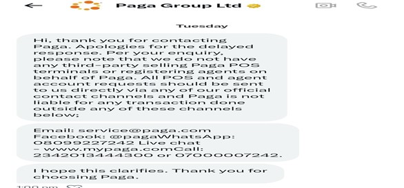 Furthermore, we reached out to Paga through its social media verified account on X Paga Group Ltd., and we got a response that said that ‘Paga does not have any third-party selling Paga POS terminals or registering agents on behalf of Paga. All POS and agent account requests should be sent to us directly via any of our official contact channels, and Paga is not liable for any transaction done outside any of these channels below.
