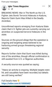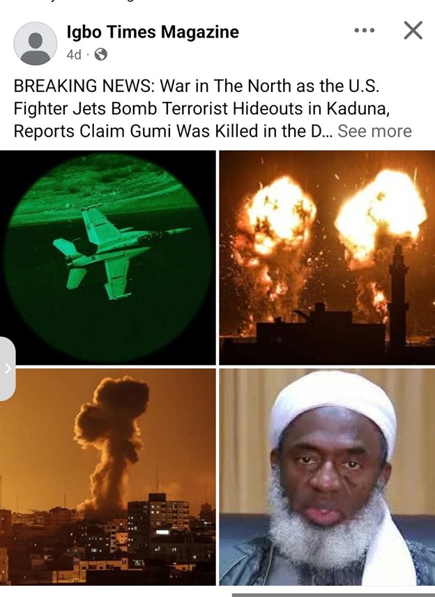 Claim: A Facebook page claimed that US fighter jets bombed terrorists in Kaduna State, killing Sheikh Gumi Verdict: U.S. conducted airstrikes on terrorist hideouts in Kaduna State, killing Sheikh Gumi, is False. Full Text A Facebook page, Igbo Times Magazine, on Tuesday, 16th December, 2025, posted on its website, claiming that United States of America