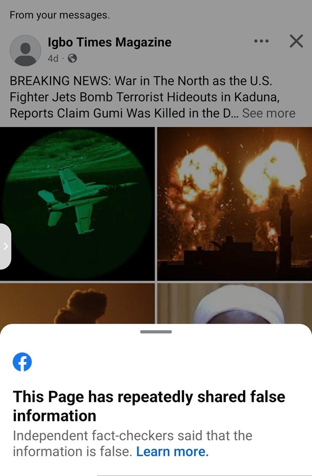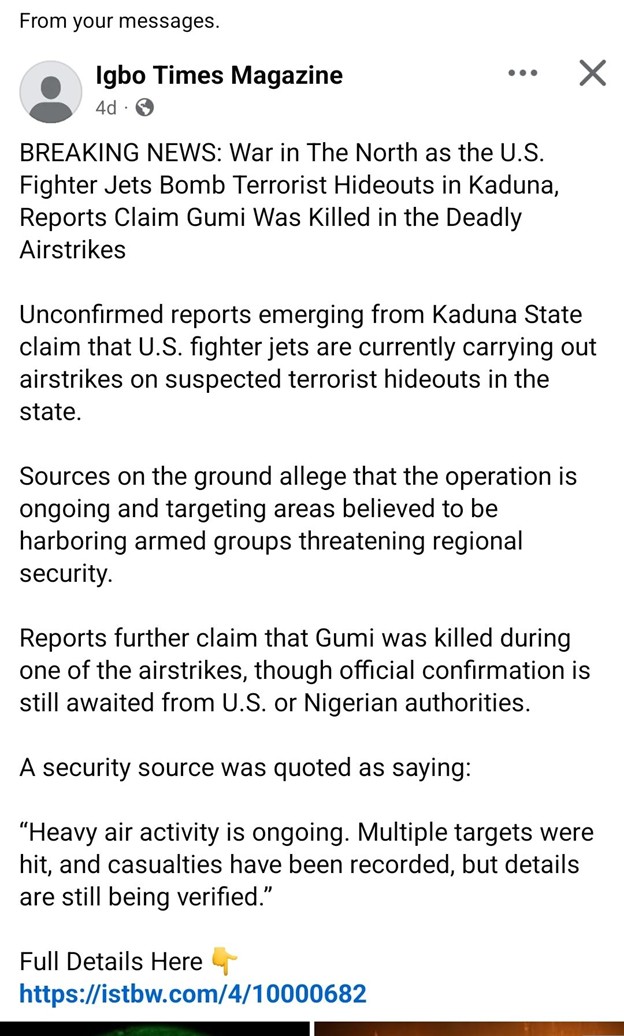 A Facebook page, Igbo Times Magazine, on Tuesday, 16th December, 2025, posted on its website, claiming that United States of America fighter jets are carrying out a bombing attack on terrorists in Kaduna State, the northern part of Nigeria.