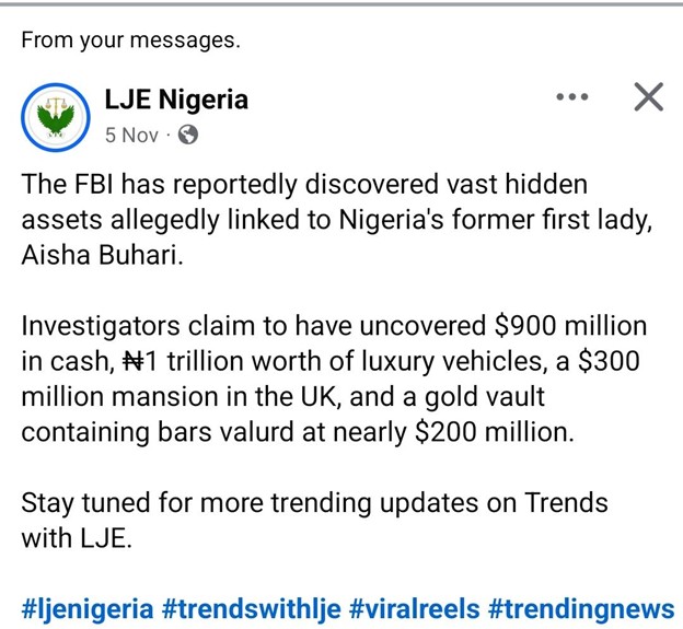 Claim: A Facebook page claimed that the United States of America Federal Bureau of Investigation has discovered hidden assets linked to the former First Lady of Nigeria, Aisha Buhari. Verdict: The Claim is False Full Text: A Facebook page posted a claim circulating that the United States of America Federal Bureau of Investigation has uncovered a