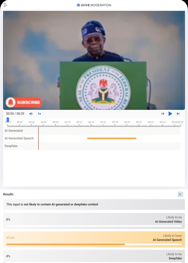 NDRFactcheck subjected the video to the use of other reliable detection tools, including Deepware’s scanner and Tencent’s AI detection assistant; only Hivemoderation could analyse the video, and it detected an AI-generated speech.