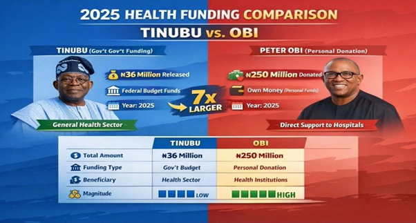 Following reports of underfunding in the health sector, social media users circulated claims comparing federal releases with Obi’s personal donations. The chart shared by @mickoly suggested Obi’s contributions far exceeded government releases.